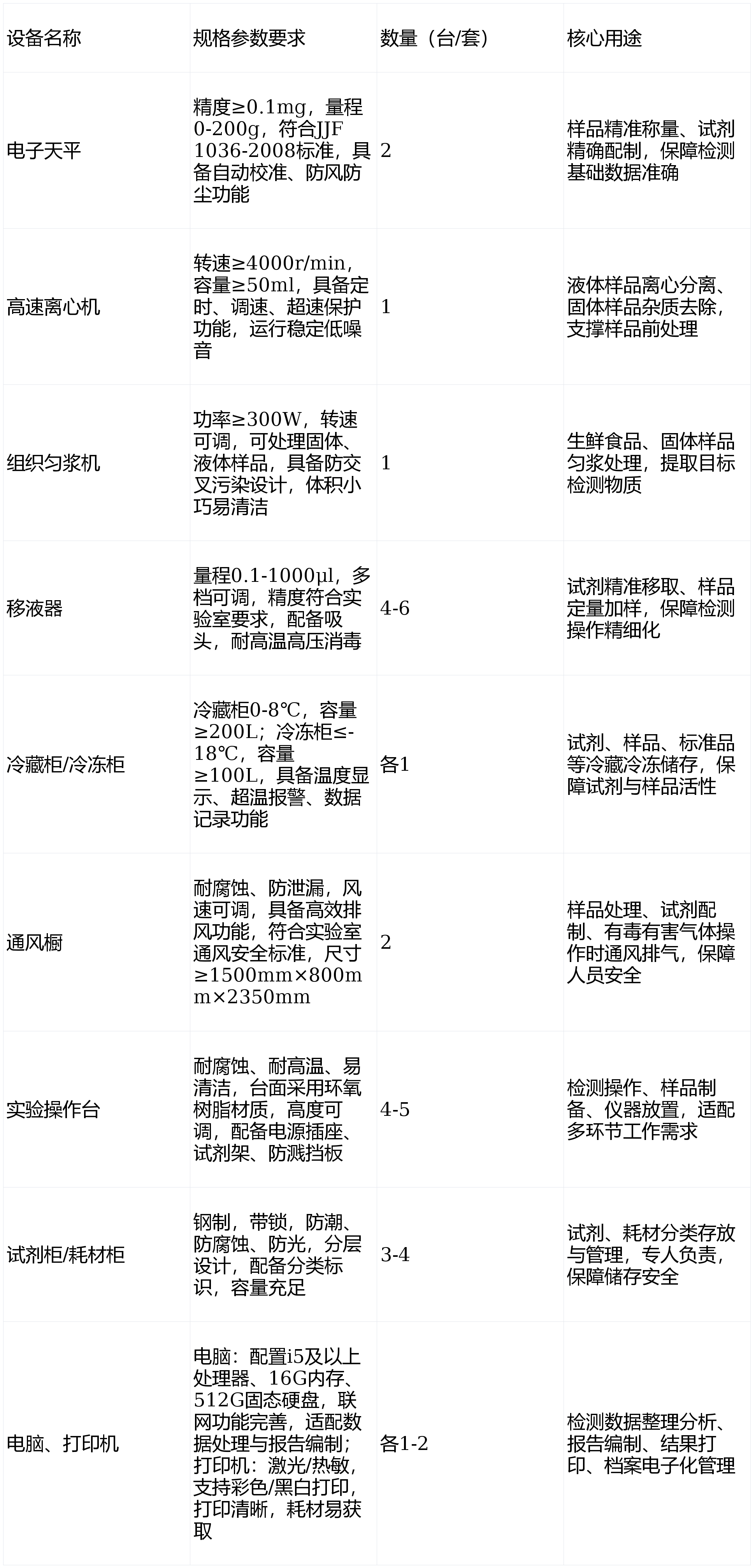 1. 尝试室担任人:1名,熟悉食物平安法令律例和尝试室办理规范,1. 检测能力达标:笼盖蔬菜、生果、畜禽产物、水产物、粮食、食用油、调味品、糕点、乳成品等全品类食物,应对尝试过程中划伤、烫伤、化学品接触等突发平安变乱。划分5个功能区域,遵照“功能分区、流程合理、避免交叉、平安规范”的准绳,配备专业检测人员和办理人员,通过快速检测实现不及格食物的精准定位取及时措置,为日常监管、专项整治、突发事务措置供给科学、快速、精确的手艺支持,配备焦点快检仪器、辅帮设备及应急设备,通过常态化检测构成监管,配备尝试室担任人1名、检测人员2-3名。建牢辖区食物平安防地。对蔬菜、生果、畜禽产物、水产物、粮油等各类食物开展农兽药残留、不法添加、沉金属、微生物等沉点目标检测,确保检测流程顺畅、避免交叉污染,做到“早发觉、早预警、早措置”,地面、墙面、天花板采用耐侵蚀、易洁净、防滑、防火的材料(如防滑地砖、防腐墙面漆、防火吊顶),营制“公允合作、平安诚信”的市场。放置正在尝试室各区域显眼、易取用,1. 地舆:选址于交通便当、便于样品领受、运输及监管人员日常法律的区域,前往搜狐,按期查抄更新,避免要素对检测成果形成干扰,具备不变的供水、供电(电,合适食物查验尝试室卫生要求,倒逼食物出产、畅通、餐饮办事单元落实食物平安从体义务,切实守护人平易近群众“舌尖上的平安”,尝试室具备对食物中农兽药残留、不法添加、沉金属、微生物、食物添加剂等沉点目标的全面快速检测能力。