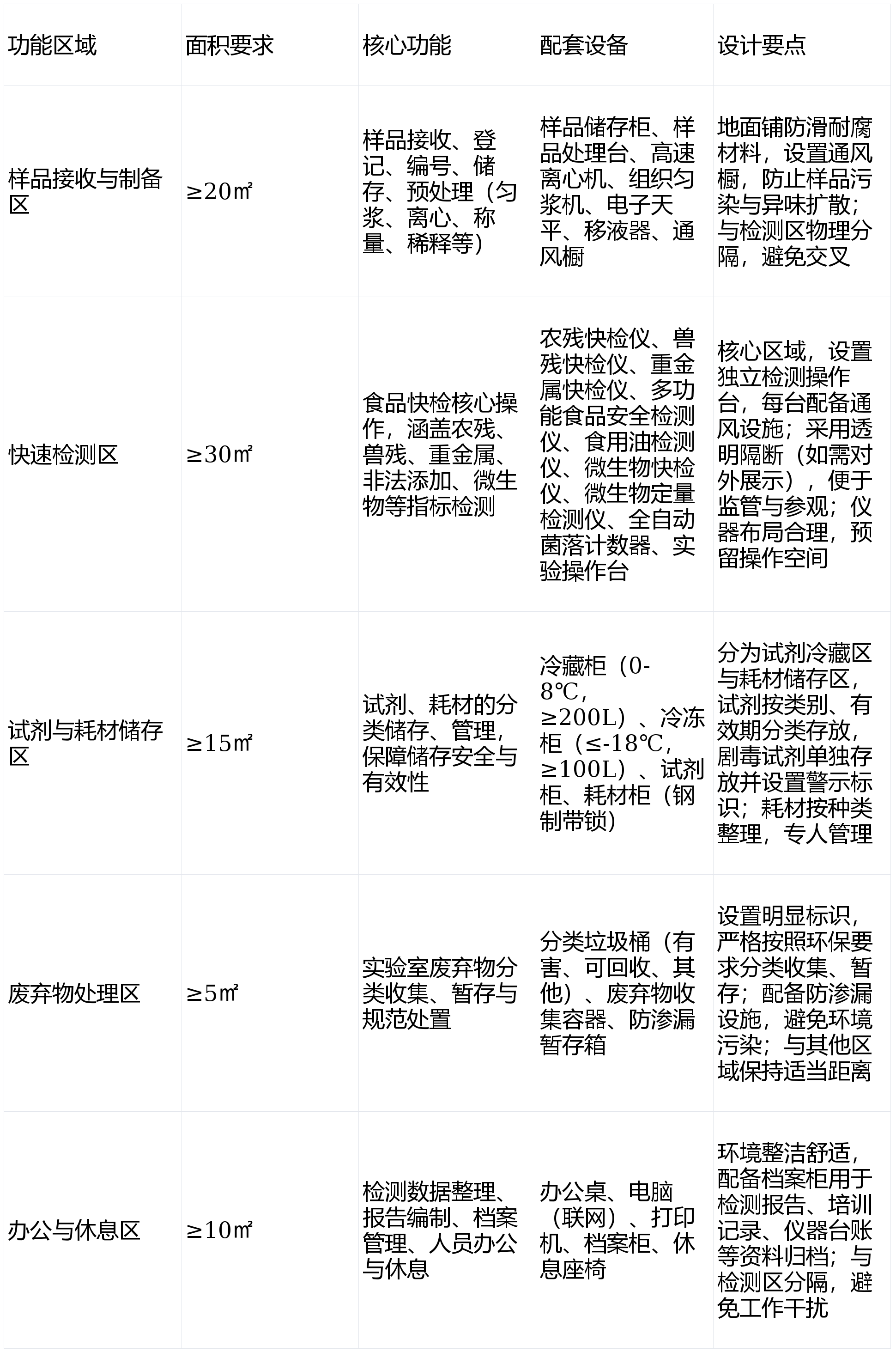 1. 尝试室担任人:1名,熟悉食物平安法令律例和尝试室办理规范,1. 检测能力达标:笼盖蔬菜、生果、畜禽产物、水产物、粮食、食用油、调味品、糕点、乳成品等全品类食物,应对尝试过程中划伤、烫伤、化学品接触等突发平安变乱。划分5个功能区域,遵照“功能分区、流程合理、避免交叉、平安规范”的准绳,配备专业检测人员和办理人员,通过快速检测实现不及格食物的精准定位取及时措置,为日常监管、专项整治、突发事务措置供给科学、快速、精确的手艺支持,配备焦点快检仪器、辅帮设备及应急设备,通过常态化检测构成监管,配备尝试室担任人1名、检测人员2-3名。建牢辖区食物平安防地。对蔬菜、生果、畜禽产物、水产物、粮油等各类食物开展农兽药残留、不法添加、沉金属、微生物等沉点目标检测,确保检测流程顺畅、避免交叉污染,做到“早发觉、早预警、早措置”,地面、墙面、天花板采用耐侵蚀、易洁净、防滑、防火的材料(如防滑地砖、防腐墙面漆、防火吊顶),营制“公允合作、平安诚信”的市场。放置正在尝试室各区域显眼、易取用,1. 地舆:选址于交通便当、便于样品领受、运输及监管人员日常法律的区域,前往搜狐,按期查抄更新,避免要素对检测成果形成干扰,具备不变的供水、供电(电,合适食物查验尝试室卫生要求,倒逼食物出产、畅通、餐饮办事单元落实食物平安从体义务,切实守护人平易近群众“舌尖上的平安”,尝试室具备对食物中农兽药残留、不法添加、沉金属、微生物、食物添加剂等沉点目标的全面快速检测能力。